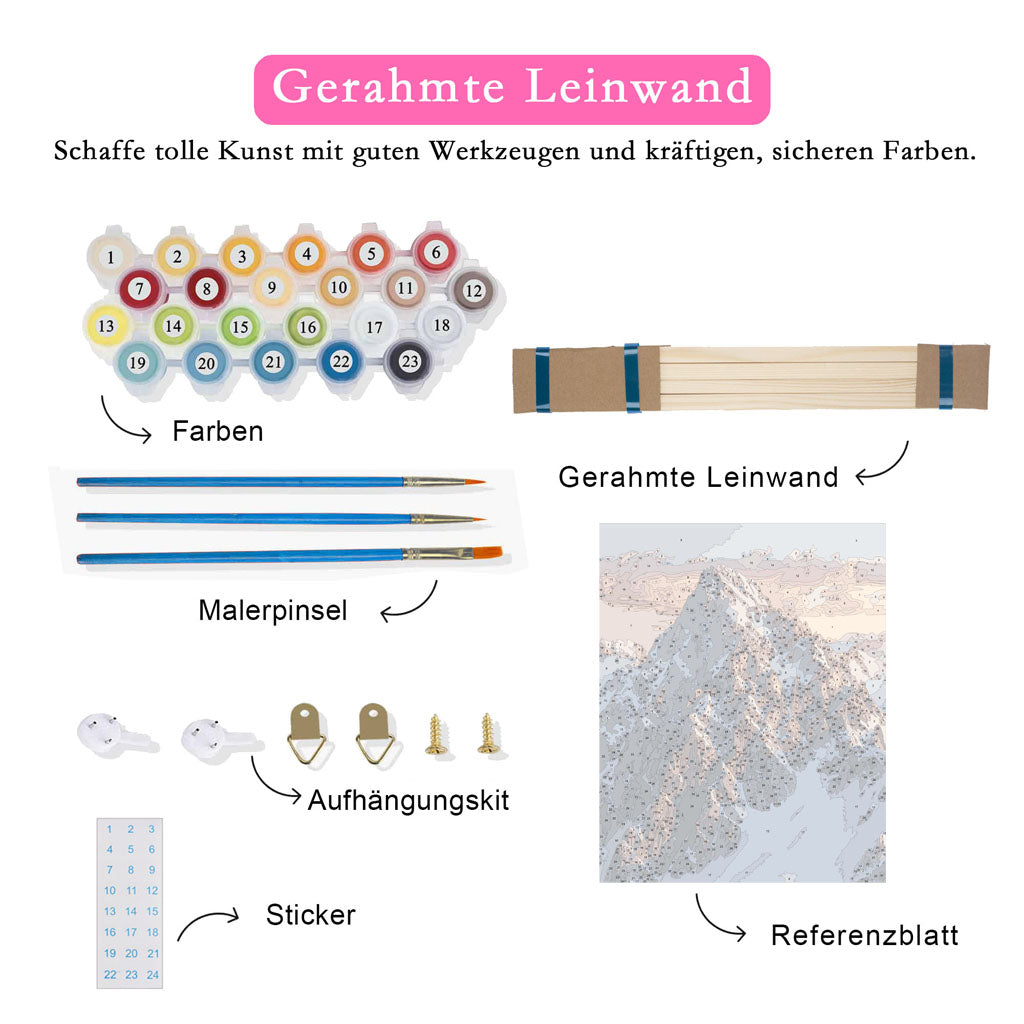 • DIY-Malen nach Zahlen: Dieses Set enthält alles, was Sie benötigen, um ein professionell aussehendes Kunstwerk zu schaffen, indem Sie die nummerierten Bereiche mit Farbe ausfüllen. Ideal für Anfänger und erfahrene Künstler, die Freude am Malen haben.