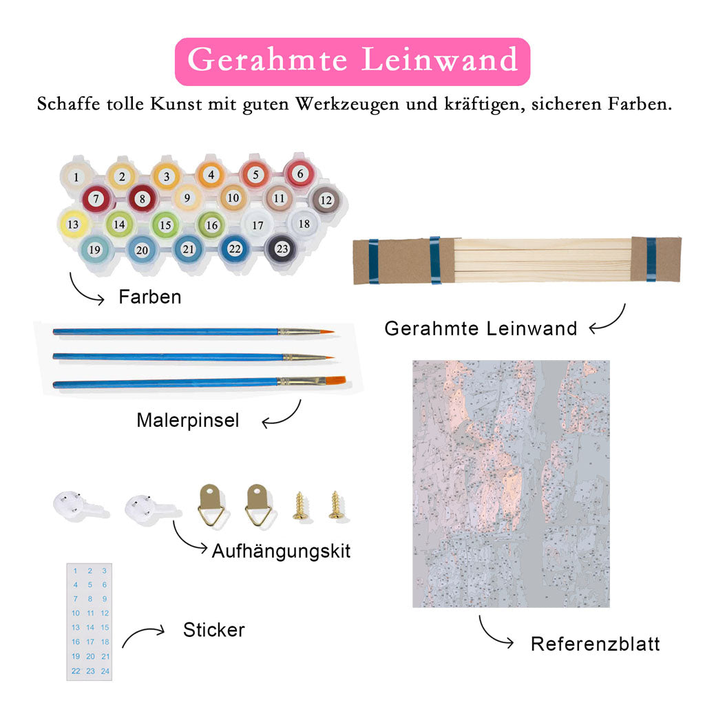 • DIY-Malen nach Zahlen: Dieses Set enthält alles, was Sie benötigen, um ein professionell aussehendes Kunstwerk zu schaffen, indem Sie die nummerierten Bereiche mit Farbe ausfüllen. Ideal für Anfänger und erfahrene Künstler, die Freude am Malen haben.