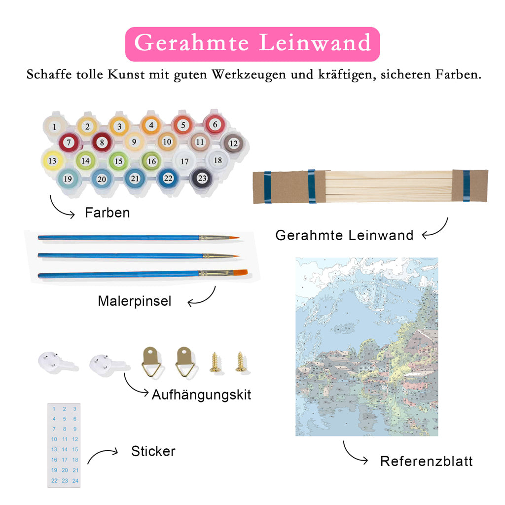 • DIY-Malen nach Zahlen: Dieses Set enthält alles, was Sie benötigen, um ein professionell aussehendes Kunstwerk zu schaffen, indem Sie die nummerierten Bereiche mit Farbe ausfüllen. Ideal für Anfänger und erfahrene Künstler, die Freude am Malen haben.