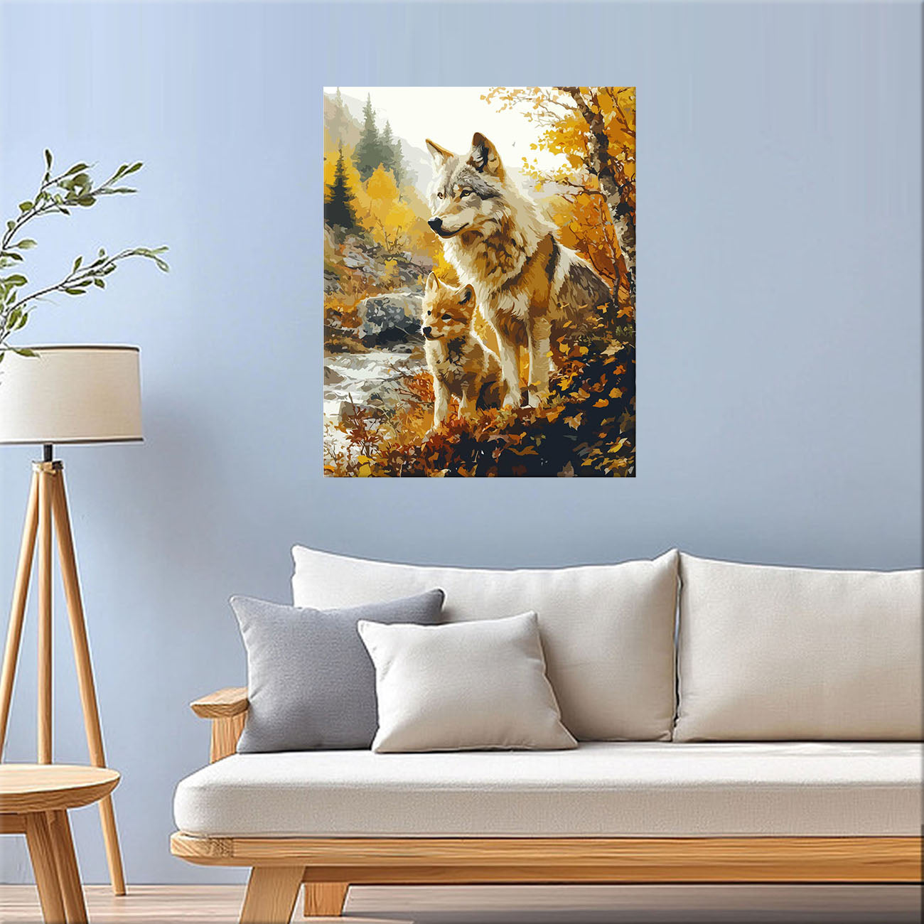 Vater - Wolf und Junges im Herbstlaub - Malen nach Zahlen